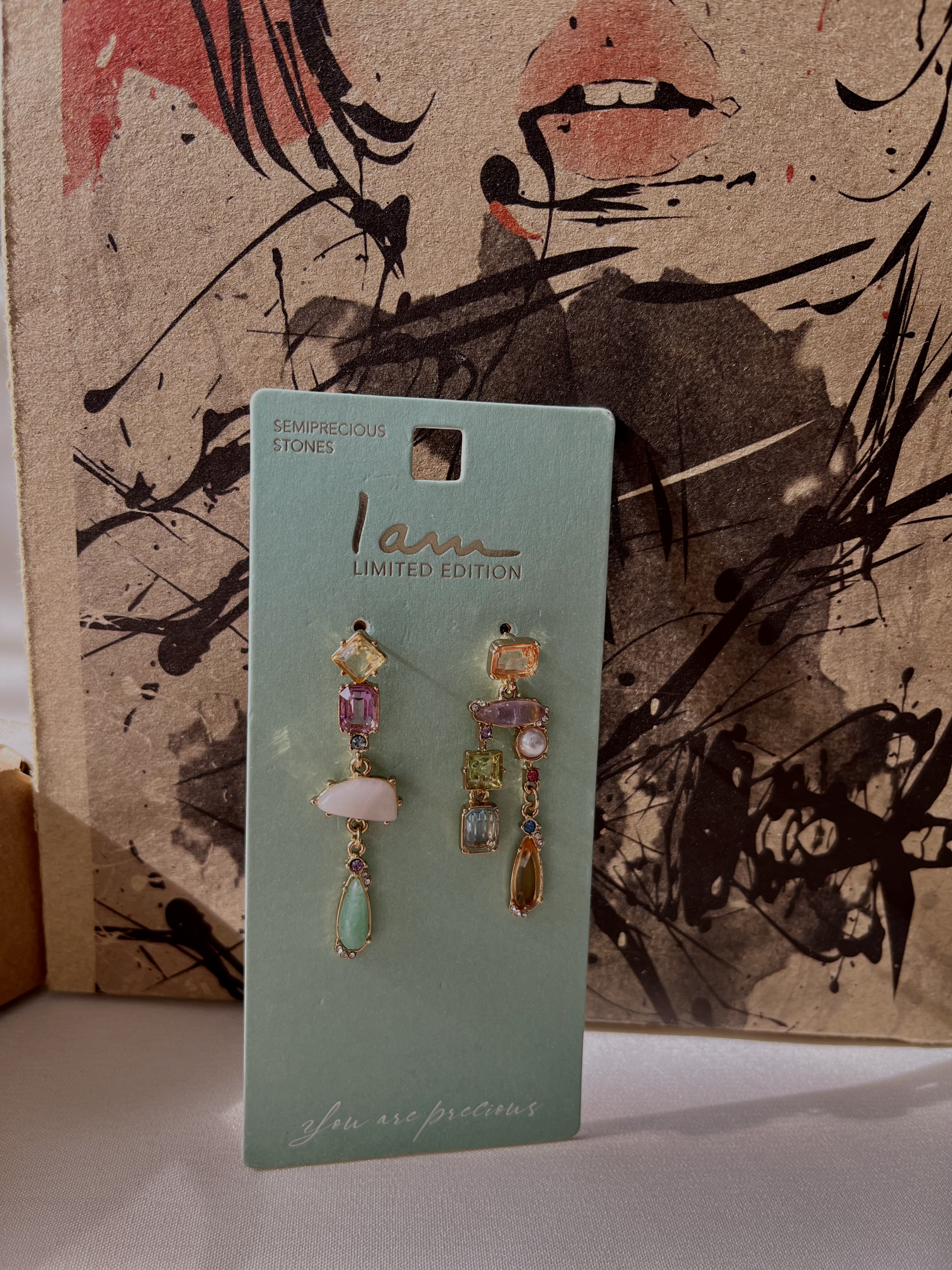 گوشواره سنگی و نگینی از برند iam رنگ ثابت. ( دور از مواد شوینده و شیمیایی) سنگ های این گوشواره از سنگ طبیعی میباشد